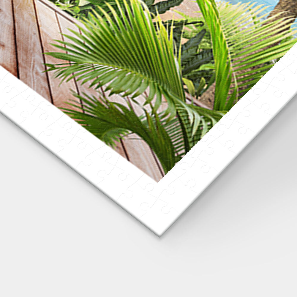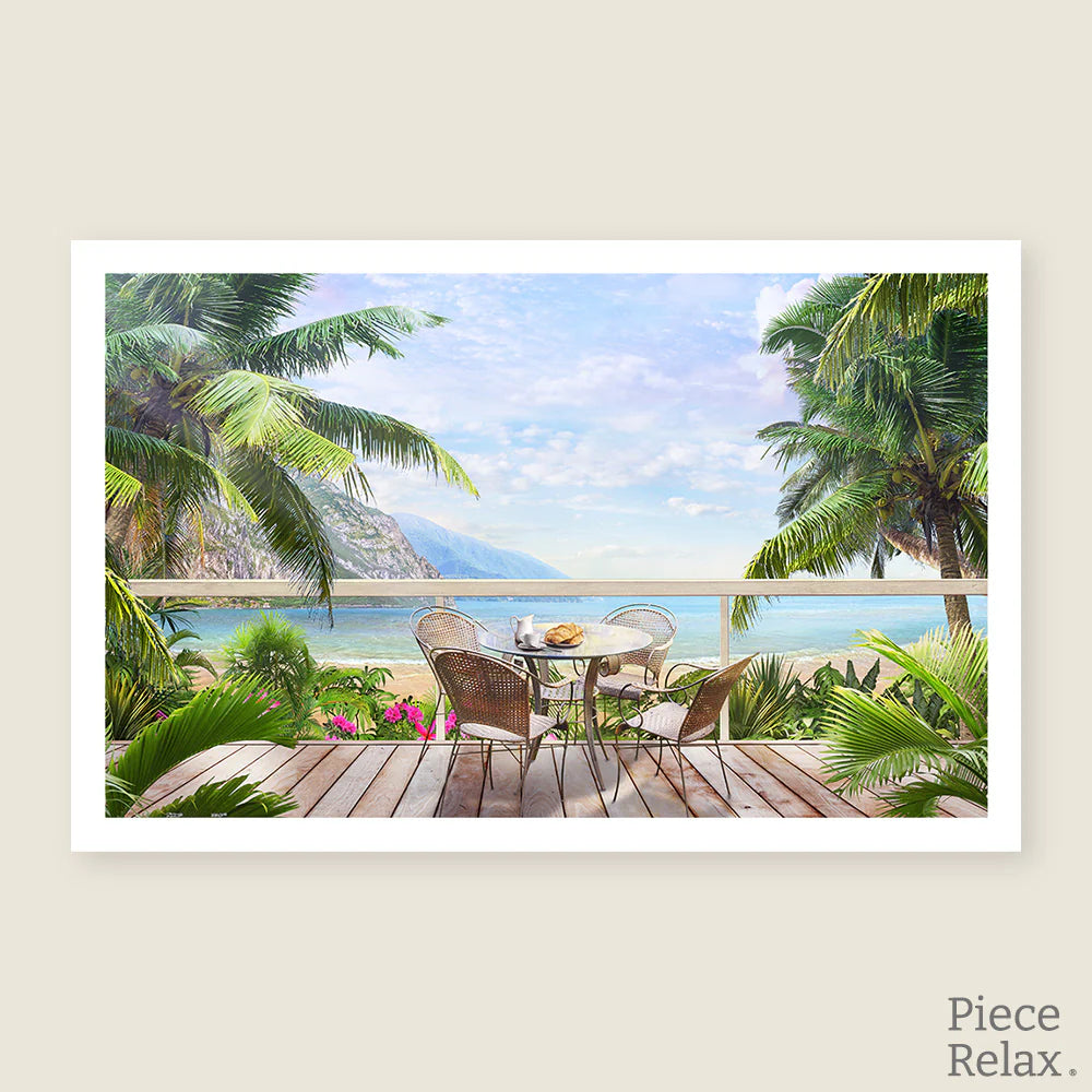 - Escape to paradise with PieceRelax! This serene scene of ocean views, lush palms, and a cozy breakfast spot will transport you to a relaxing getaway.