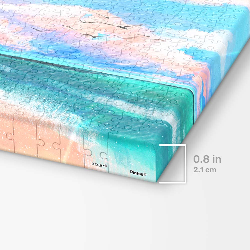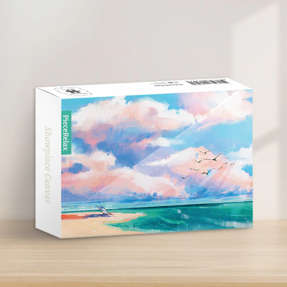 - A serene beach painting with a sailboat under fluffy clouds, a lemon soda-blue ocean, and sky. Infuse comfort and healing vibes into your home with PieceRelax canvas puzzle.