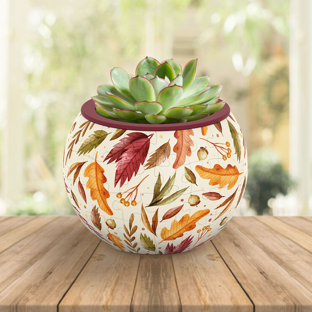 - Let us take you into the wonderful atmosphere of autumn! This exquisite plant pot is adorned with many falling leaves, perfectly showcasing the essence of fall. Whether displayed indoors or outdoors, the PieceRelax puzzle planter adds a touch of autumn charm to your surroundings.