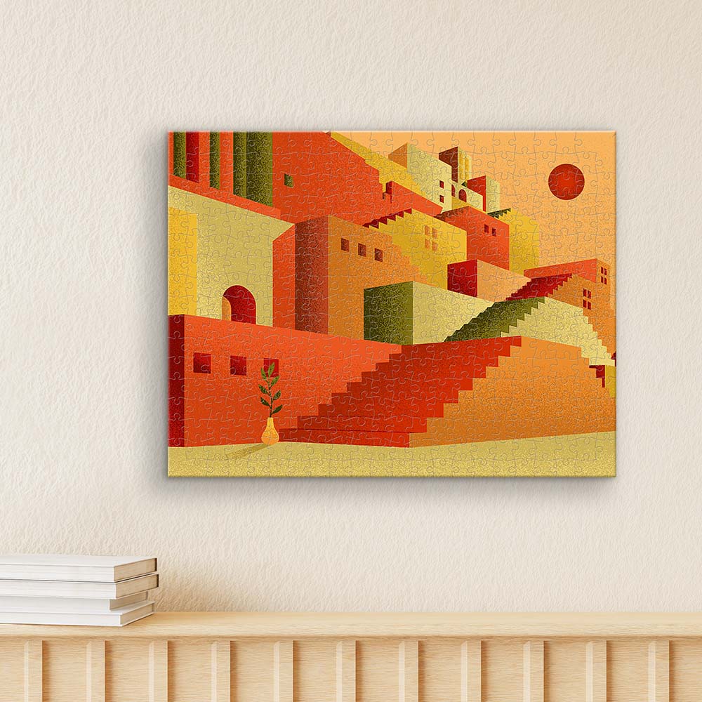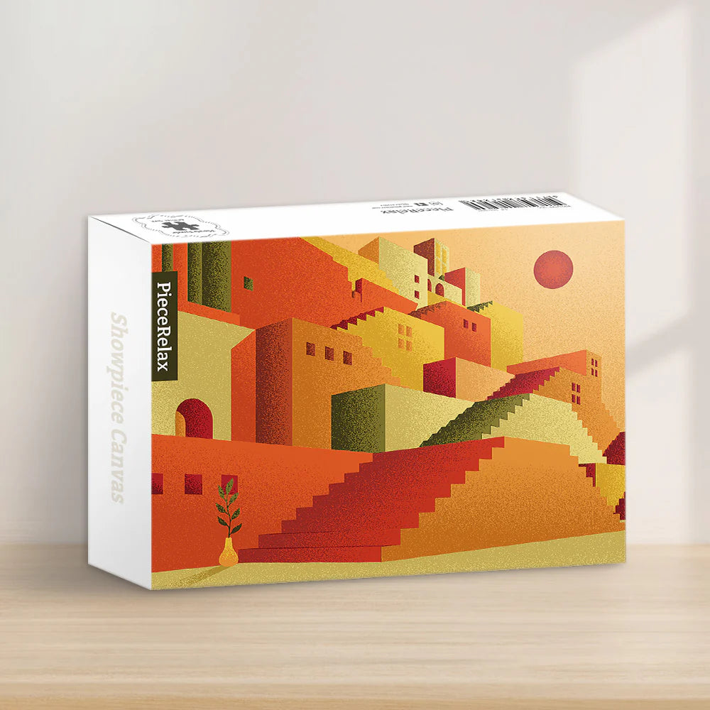 - Showcasing a city with distinct architecture, a sunset, and a summer atmosphere. Infuse comfort and healing vibes into your home with PieceRelax canvas puzzle.